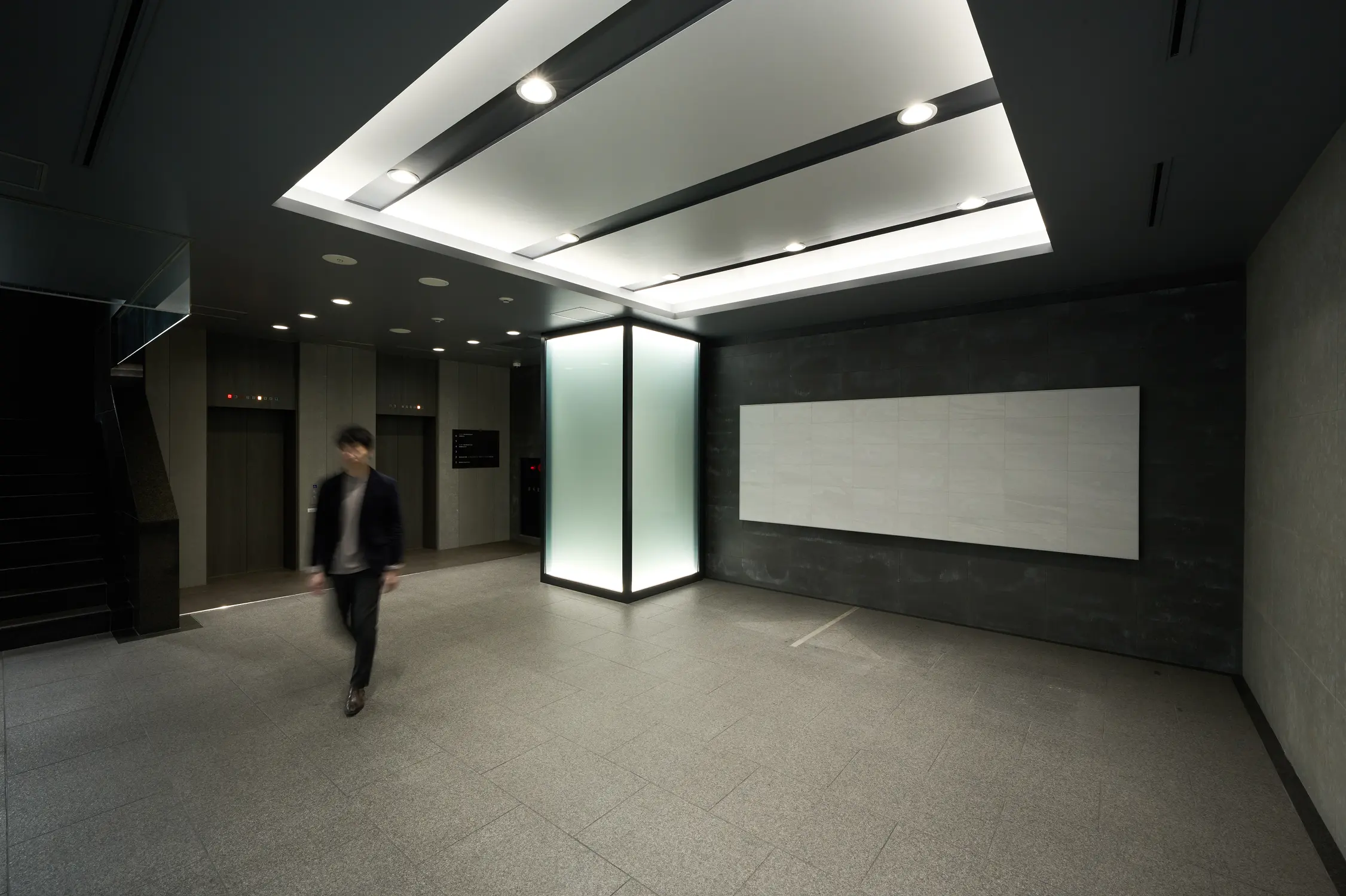 1990年竣工の中規模オフィスビルの共用部リニューアルにおいて、エントランス、屋上バルコニー、EVホールなどの設計・施工を担当しました。空間の魅力を丁寧に読み解き、「recompose(再構成)」をコンセプトに、既存の良い部分を極力活かしながら設計介入を行い、新たな秩序と静謐を空間に付加。素材選定や照明計画、環境配慮にもこだわり、建物の印象と使い勝手の刷新を通じて、資産価値の向上を目指しました。