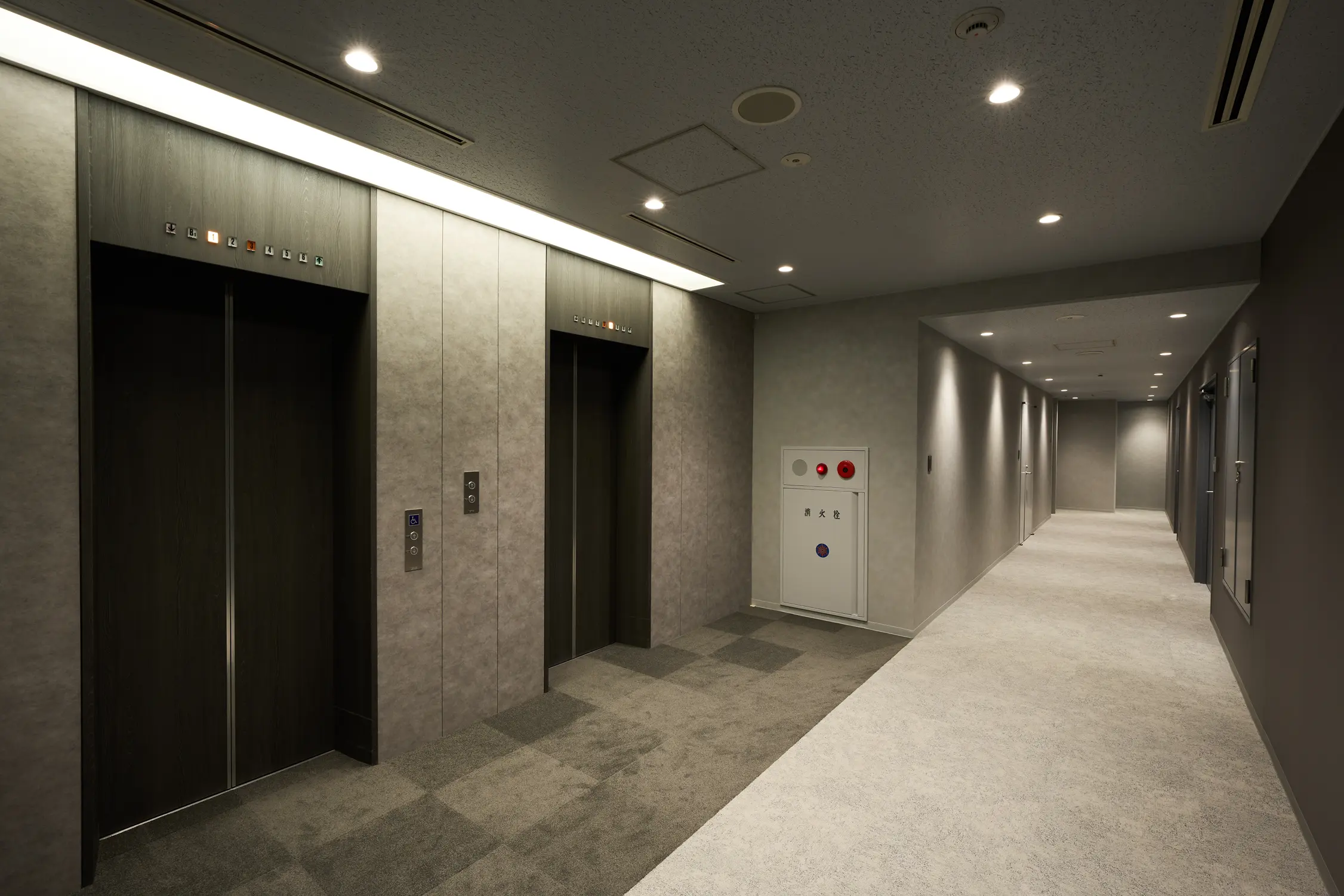 既存内装材を活かしつつ、1階のエレベーター壁面デザインを2階以上の基準階にも展開し、各階に統一感を実現。床にはリサイクルナイロン素材の環境配慮型タイルカーペットを採用し、環境負荷の軽減にも配慮しています。